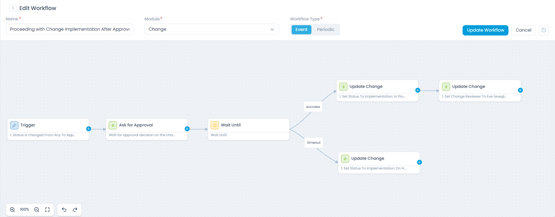 - If approval is not received within the maximum wait time, the workflow follows the Timeout path, moving the change to Implementation On Hold for further manual assessment.