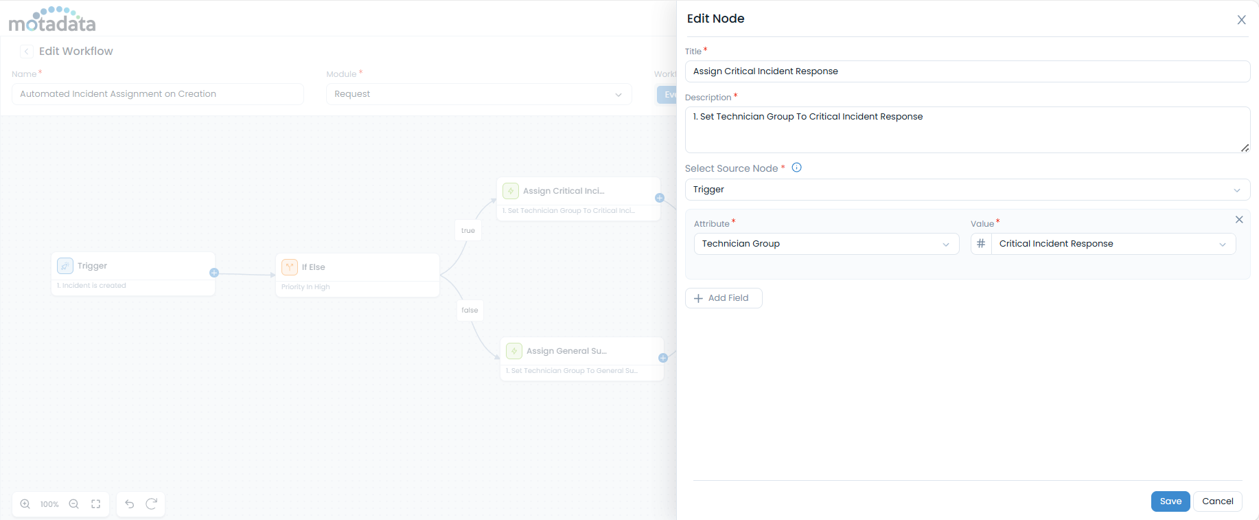 - Flow Node (If/Else): Add an "If/Else" node to evaluate the incident's priority. Set the condition either directly: