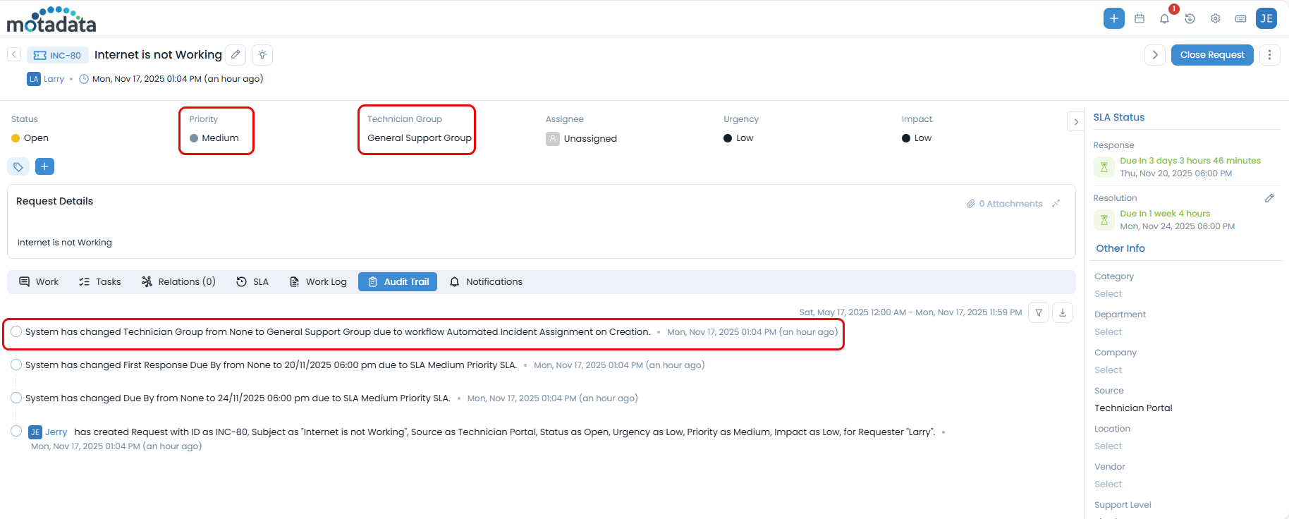 Medium Priority Incident: When a new incident with Medium (or any other non-High) priority is created, it will be assigned to the General Support Group Technician Group, and an email notification will be sent.