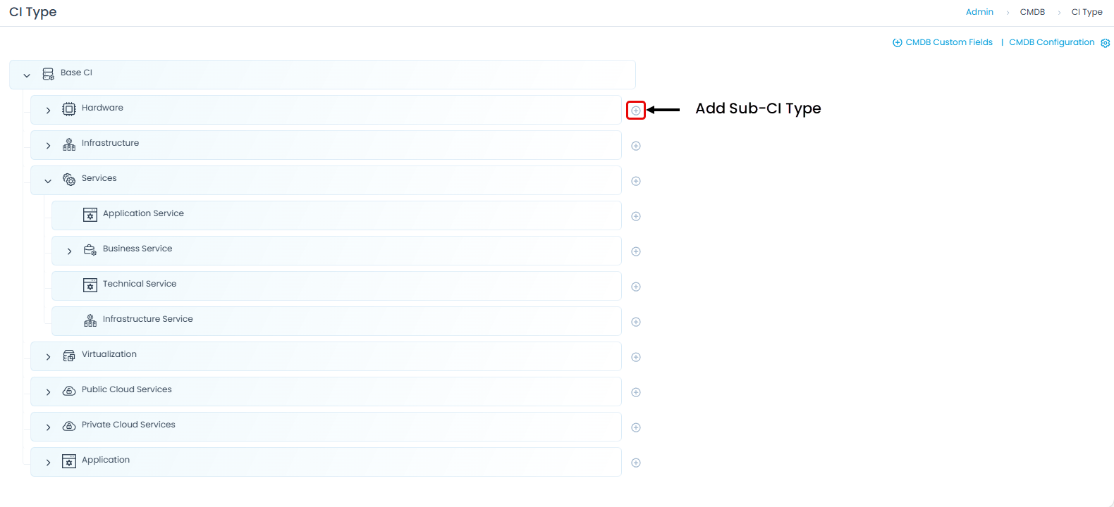 Here, you can view a list of default CI types as well as add the custom ones. You can add sub CI types up to 5 levels.