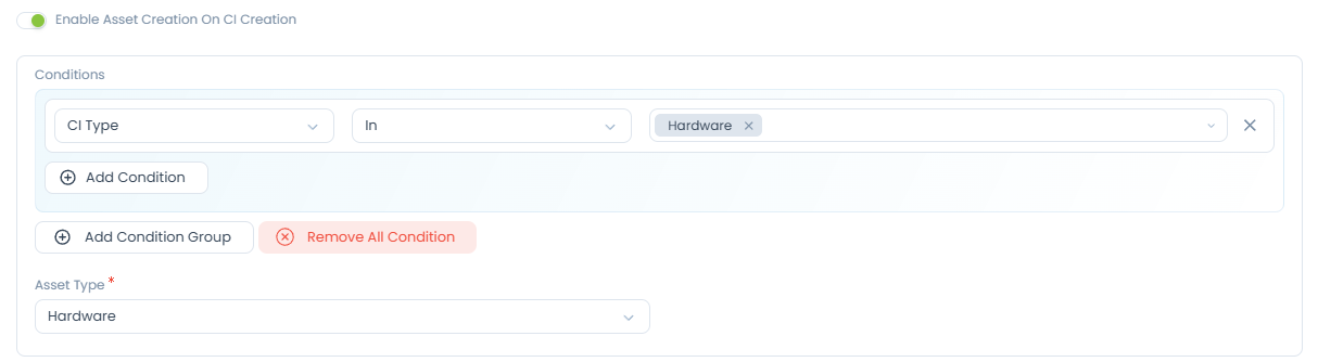 - Enable Asset Creation on CI Creation: Enable to create asset when CI is created based on condition. If enabled, select the condition and the asset type based on which the asset should be created. For example, If CI Type is Hardware, an asset of the Hardware Type will be created.