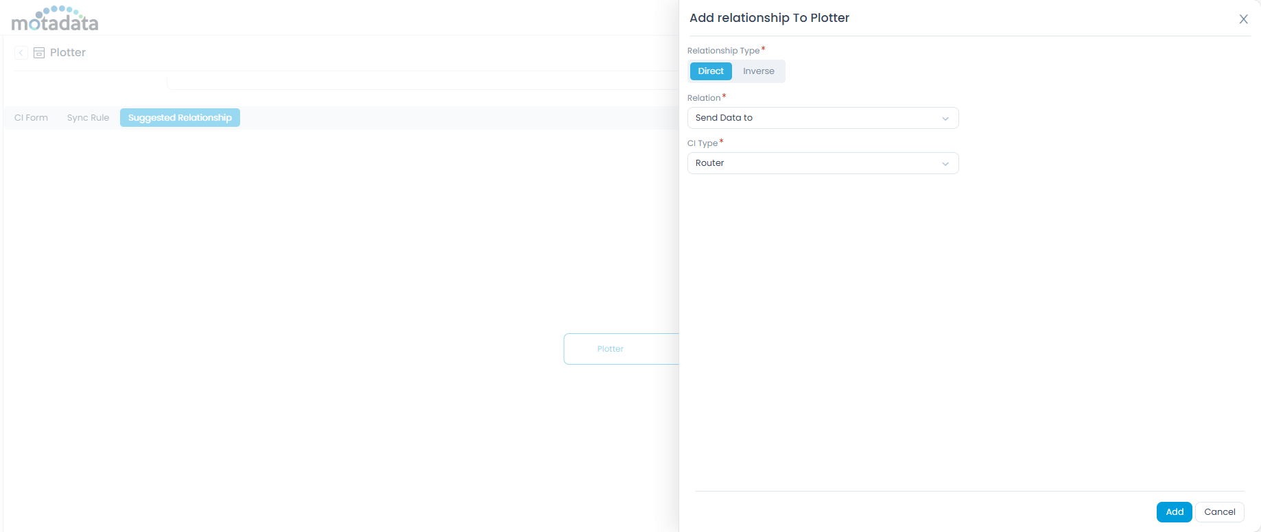 - Suggested Relationship: Enables you to create relationships between specific CI types, simplifying the process of establishing meaningful relationships when created manually.