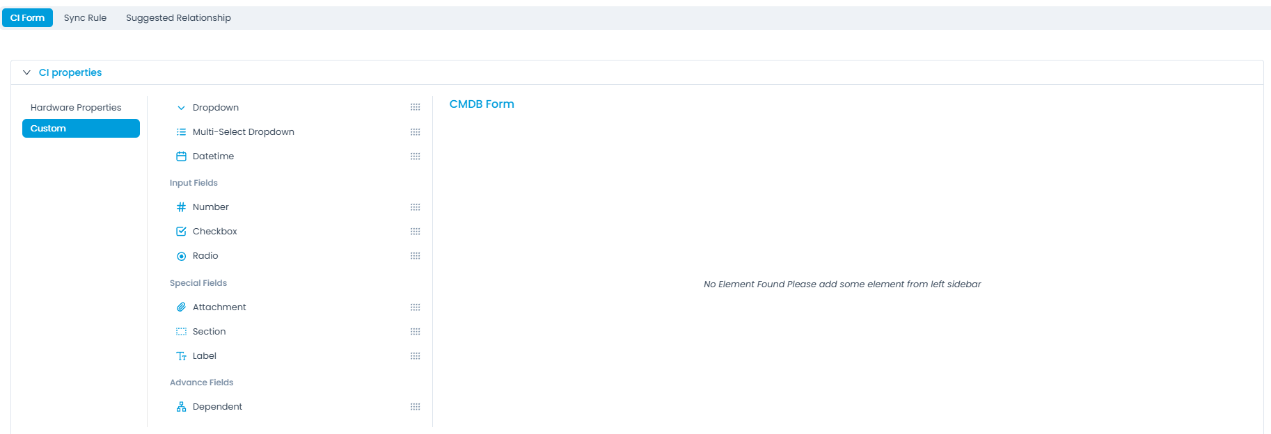- CI Form: Enables you to design the form by adding new custom fields in the properties of the CI type and in the sub CI type form itself.