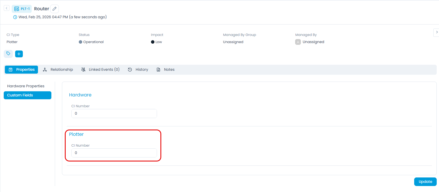 Additionally, you can add custom fields in the form of this particular CI Type (Plotter) as shown below.