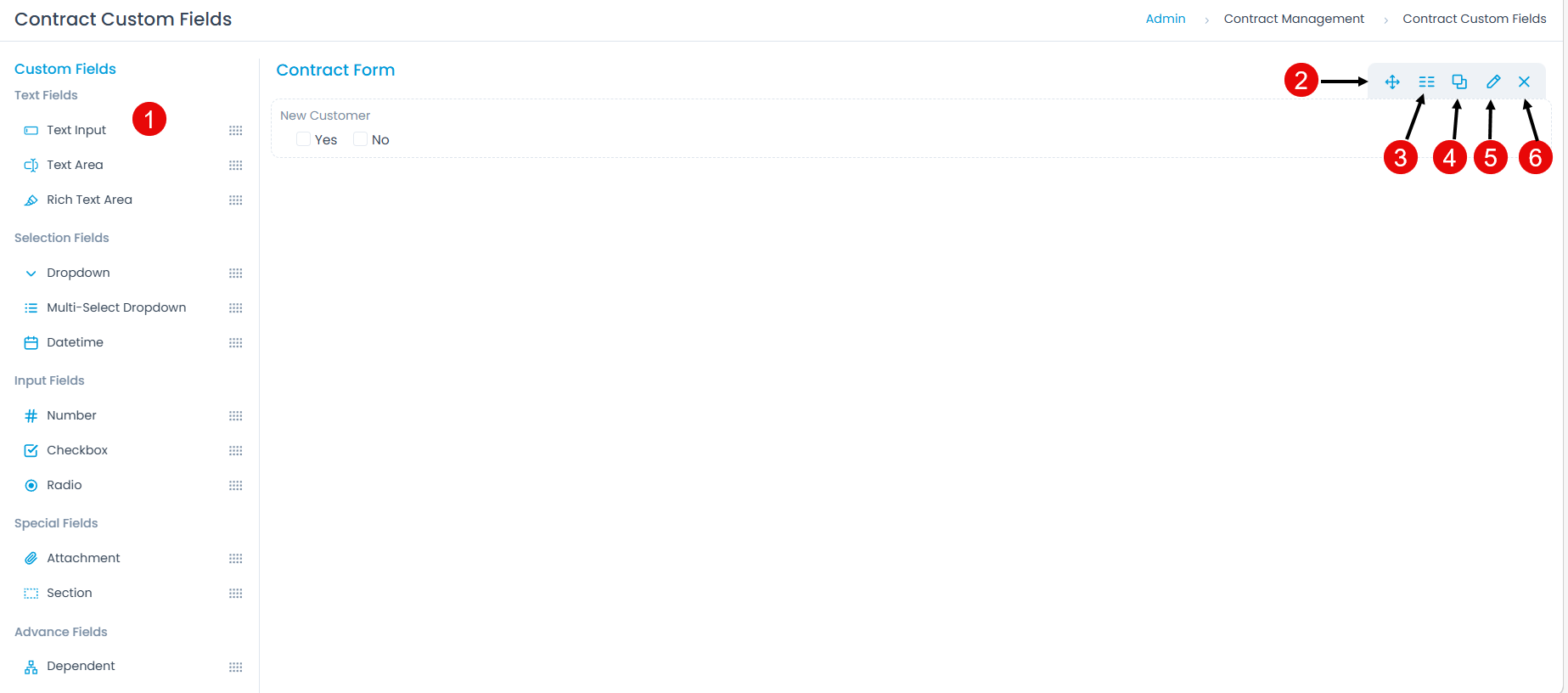 - Custom Fields: These are additional fields that can be added to the contract form from the Field palette. Custom fields provide flexibility to meet specific organizational needs. They can be renamed, modified, and deleted as required.