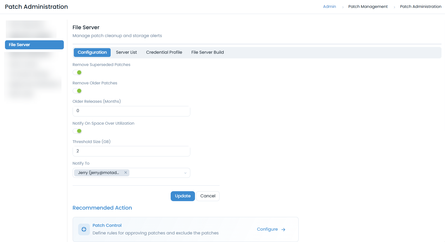 Use the Configuration tab to manage patch cleanup and storage alert settings for the file server.