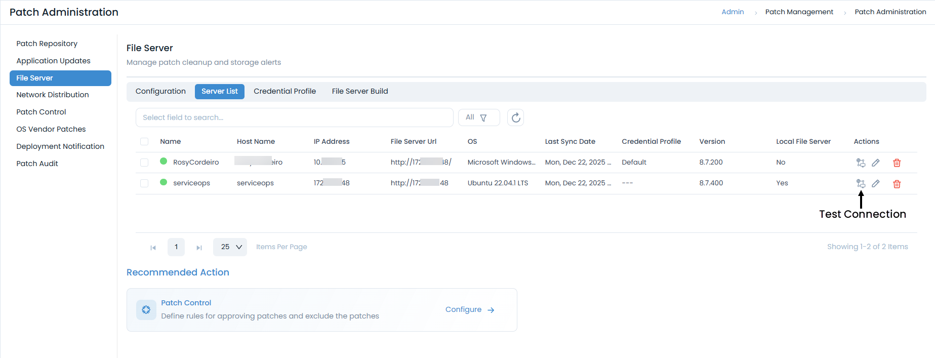 From v8.6.5 the URL field and Test Connection button have been removed from Patch Storage Configuration page to eliminate redundancy; connection testing can now be performed directly from the File Server list page via the new Test Connection action for each file server.