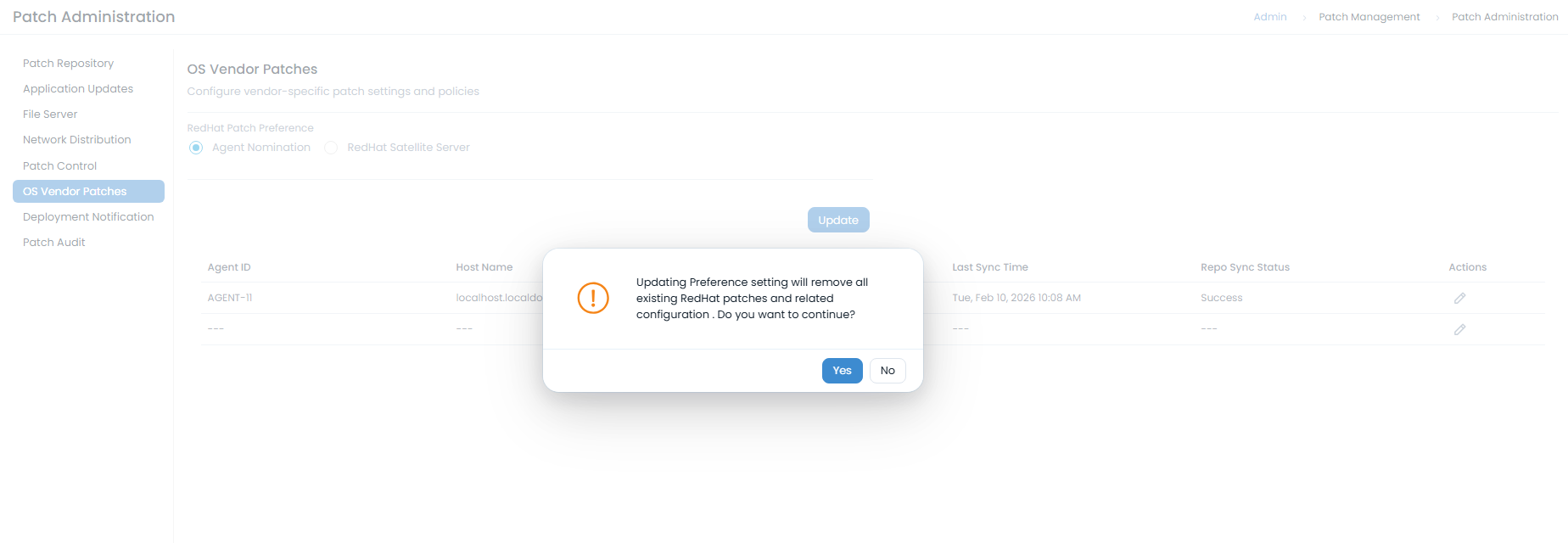 Updating the preference will remove all existing RedHat patches and agent nomination details from the Patch list.