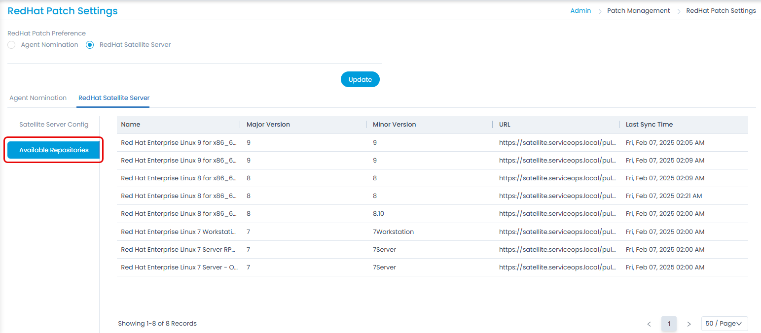 - Last Sync Time: Displays the date and time of the nominated agent's last synchronization with the RedHat repository.