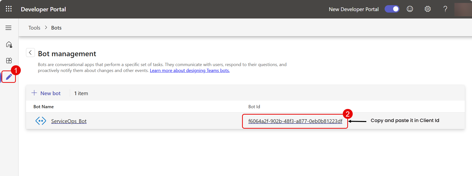 The Bot is now created and appears on the Bot Management as shown below. Copy the Bot ID and paste it into ServiceOps in the Client ID field.