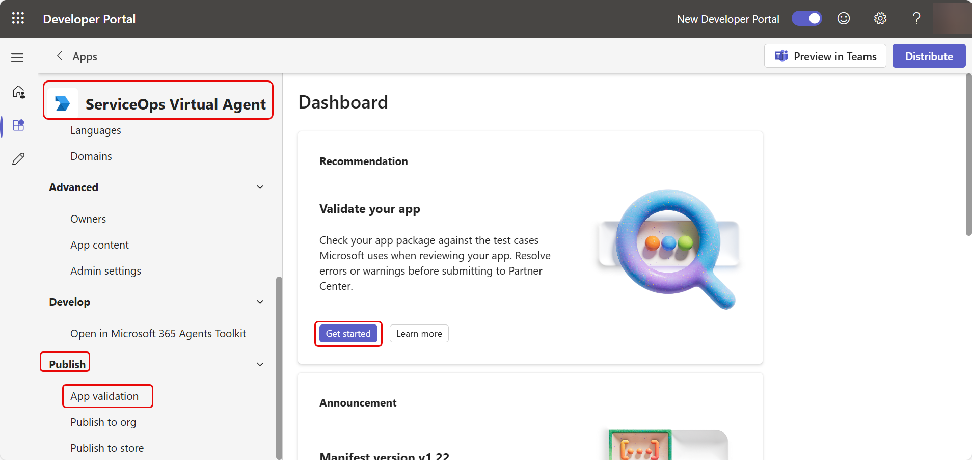 - Publish the App, In the Teams application, open the created application, navigate to Publish > App validation.