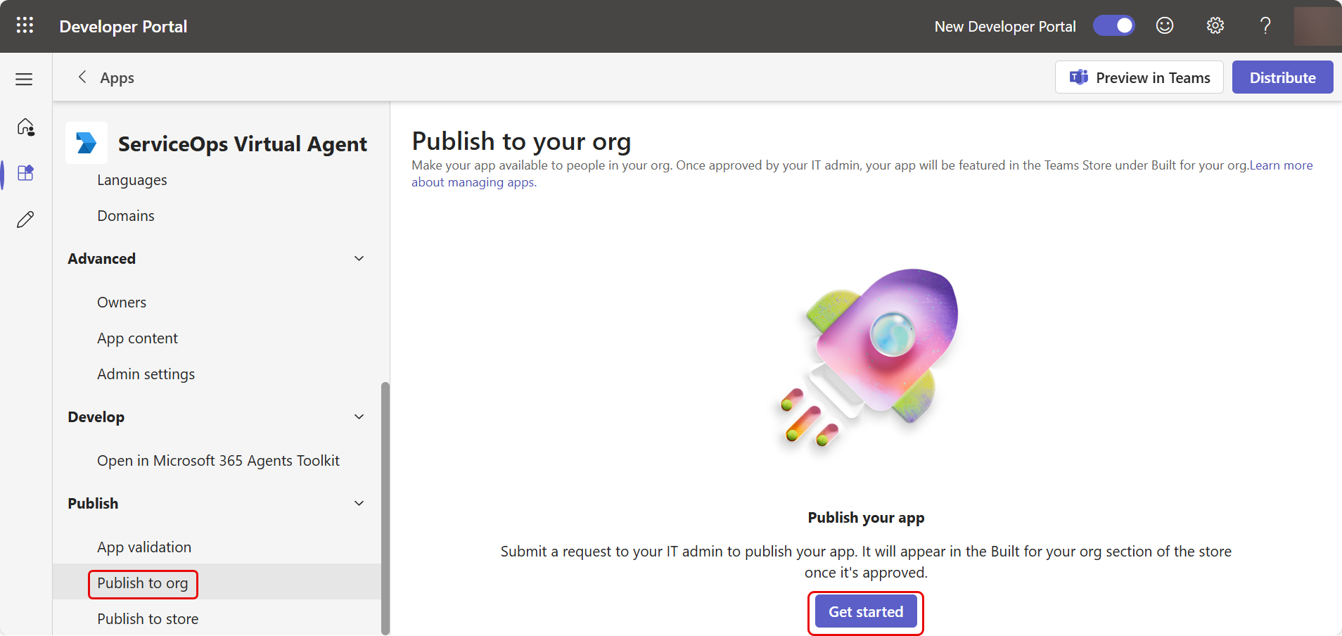 Next, to publish the created app, navigate to Publish to org tab and click Get Started.