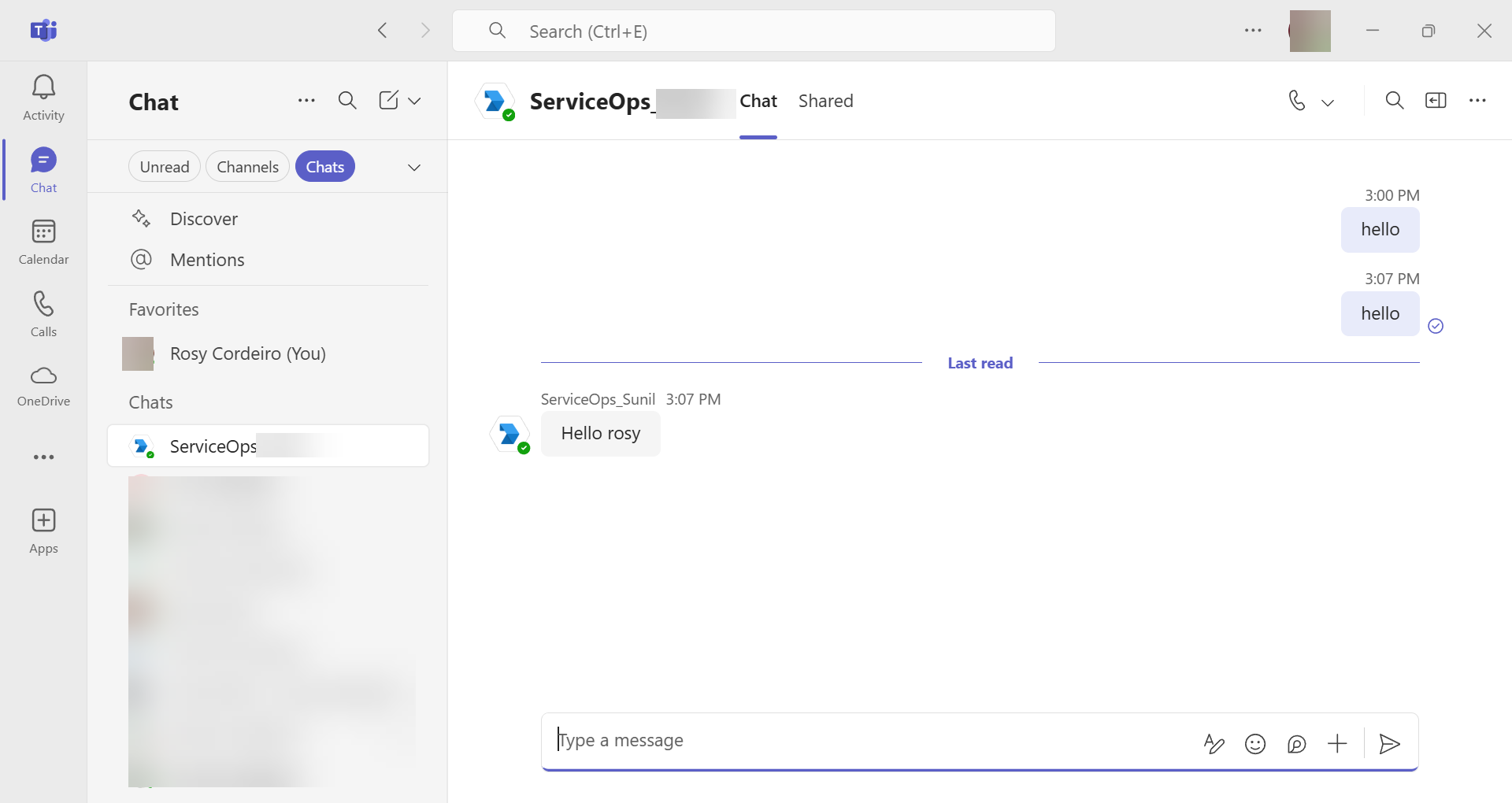Once added, type hello, and begin your conversation with the ServiceOps Virtual Agent.