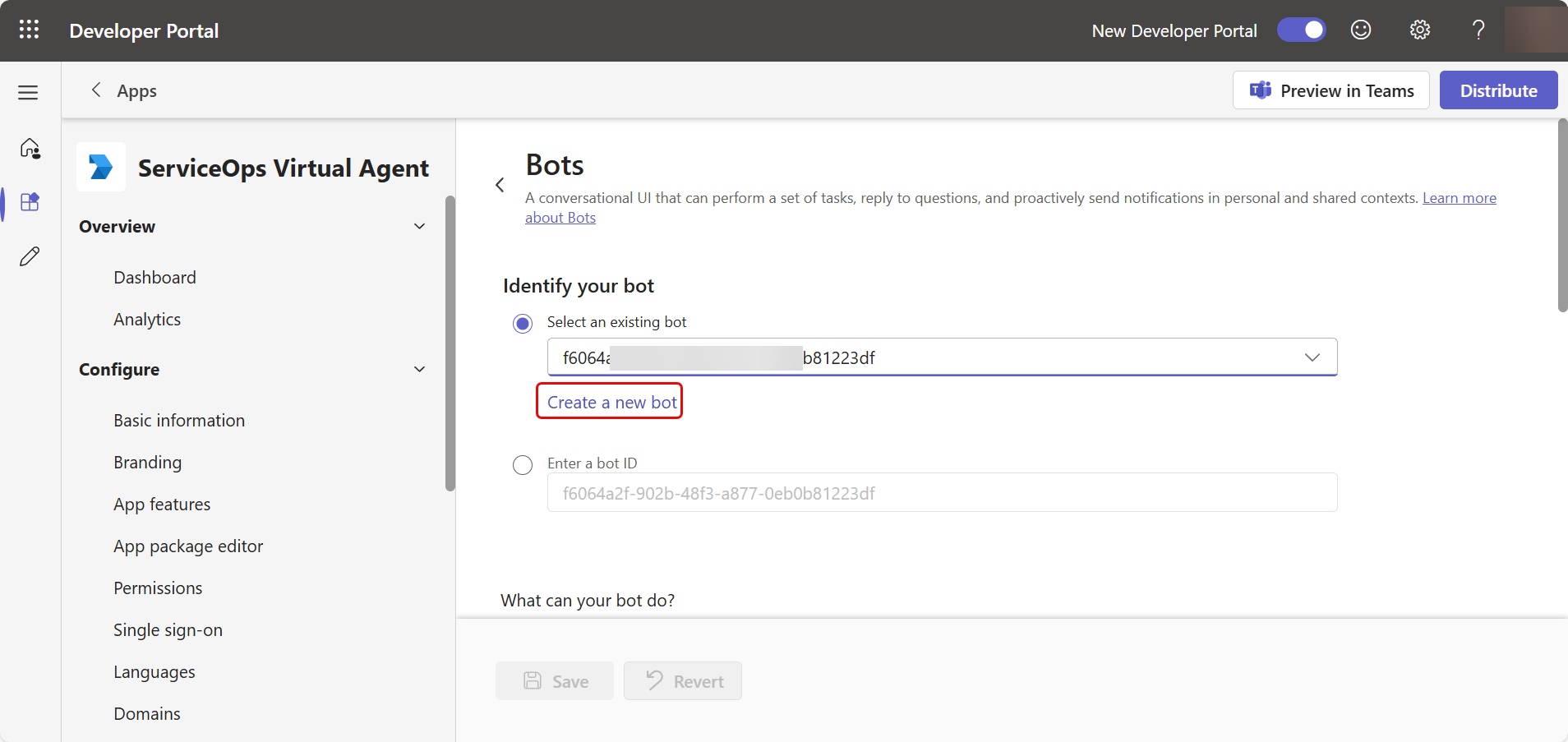 Click Create a new bot or select an existing bot if one is already registered in Azure.