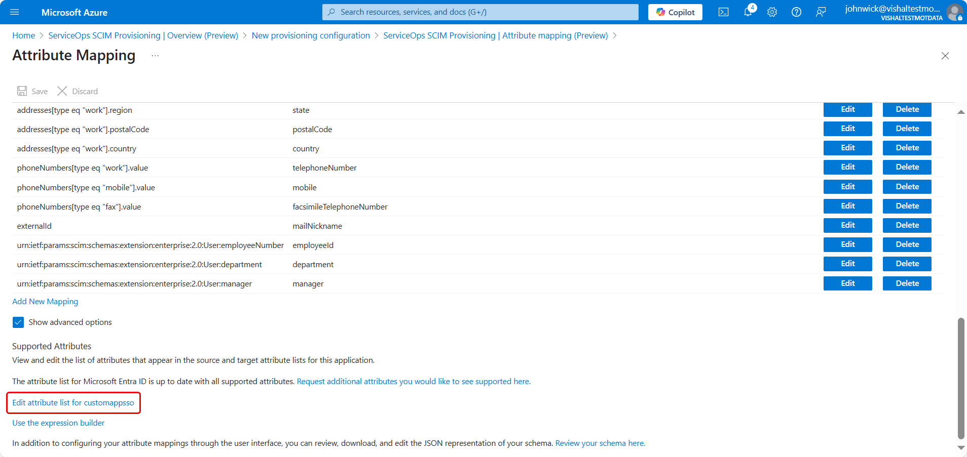 Click the Edit attribute list for customappsso link.