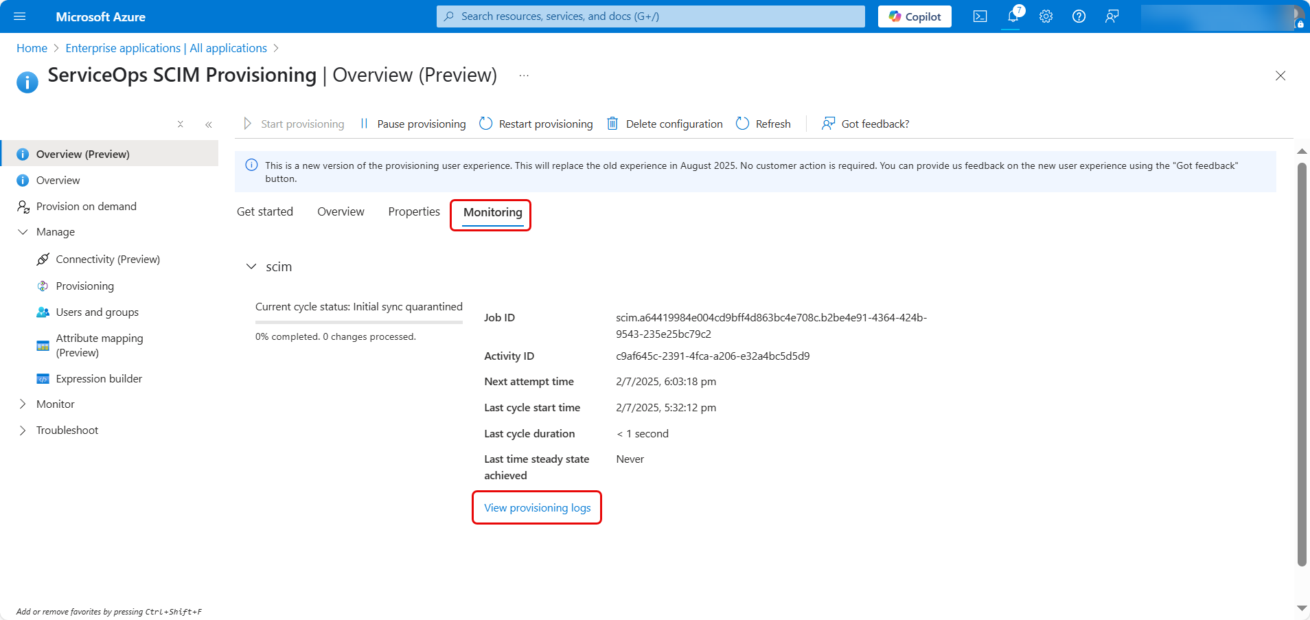 - Click on Provisioning logs to see a detailed audit trail of all actions performed by the service. This is the best place to troubleshoot any errors.