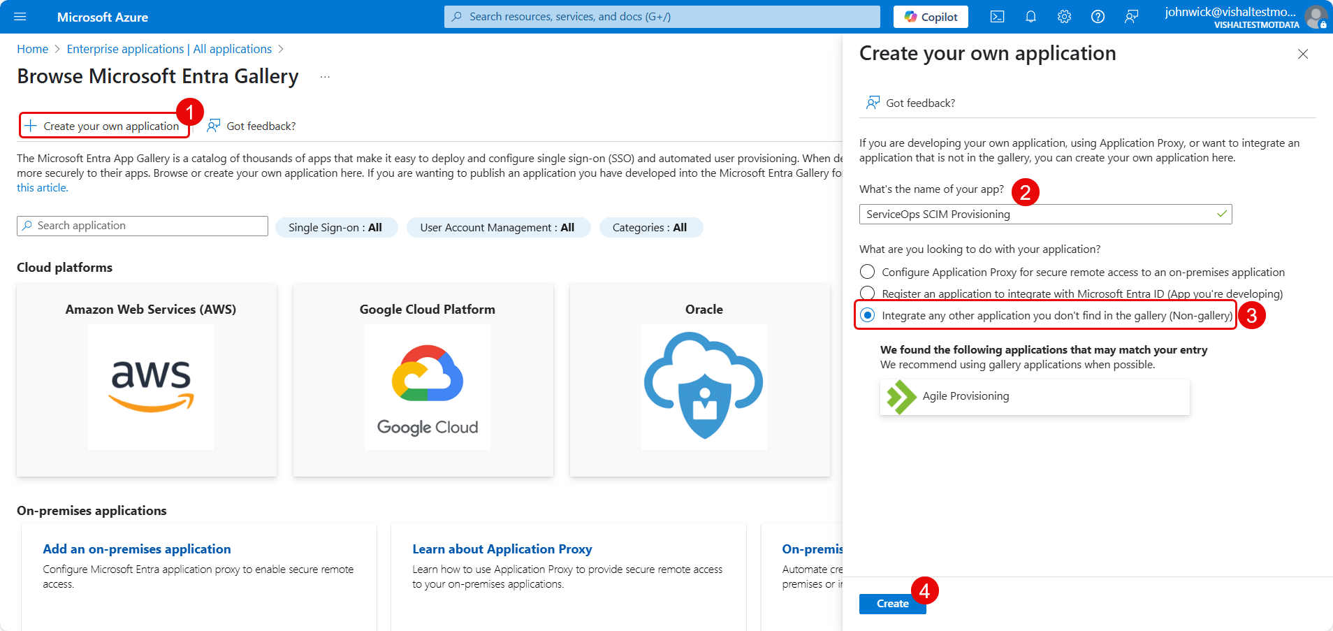 Here, enter the name of your application, select the option “Integrate any other application you don't find in the gallery (Non-gallery)”, and click Create.