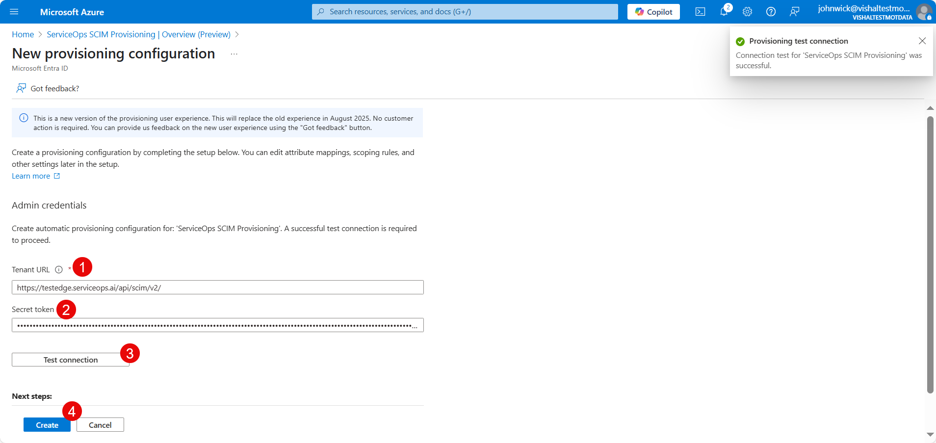 Bearer Tokenyou copied from ServiceOps into the Secret Token field.Click Test Connection. You should see a success notification confirming that Azure AD can communicate with your ServiceOps instance.