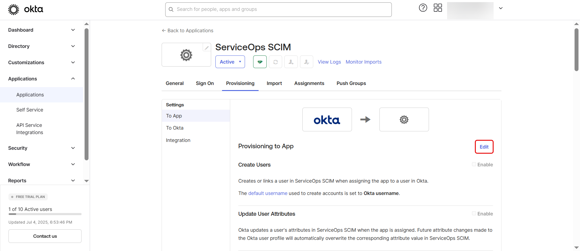 In the Provisioning tab, select To App from the left menu and click Edit.
