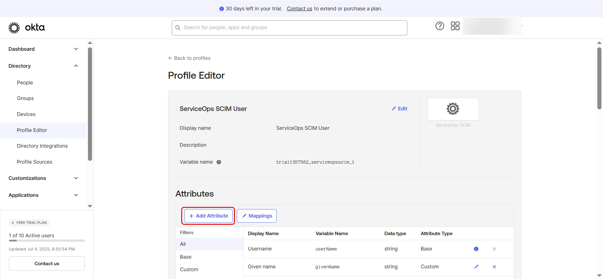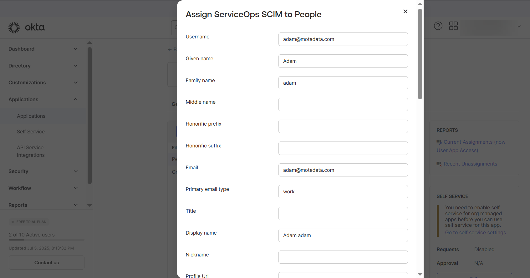 - You can test the attribute provisioning by assigning a user and reviewing their profile in ServiceOps.