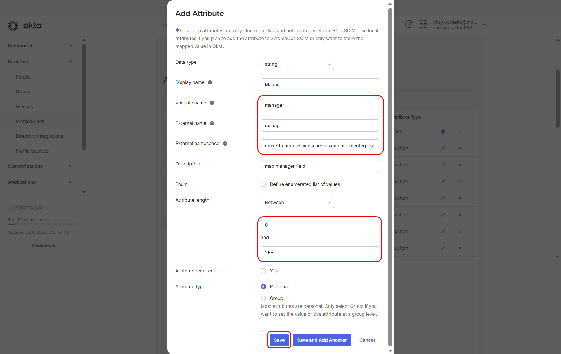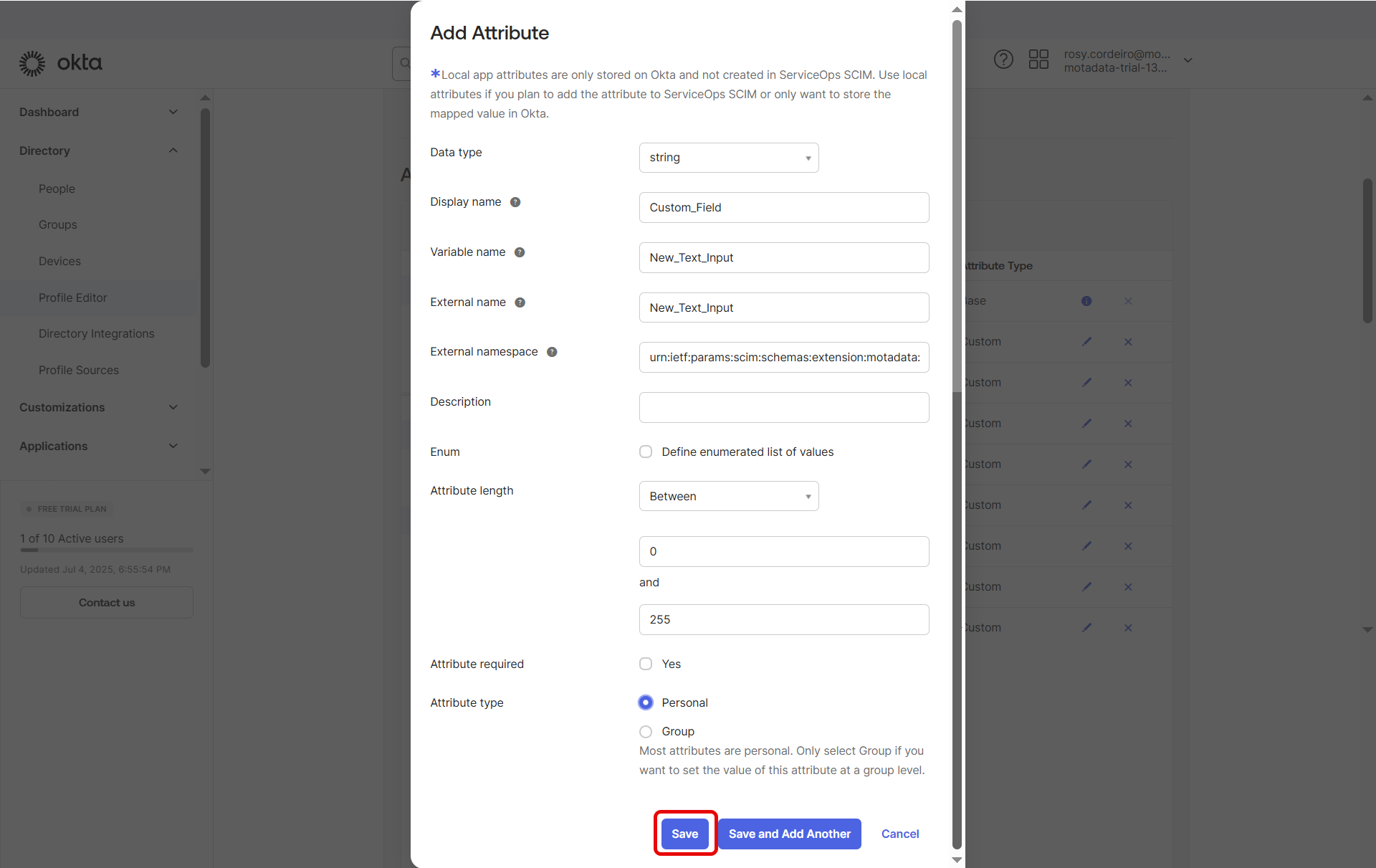 - Under ServiceOps SCIM to Okta user, link the appropriate Okta user field to your new custom field in ServiceOps.