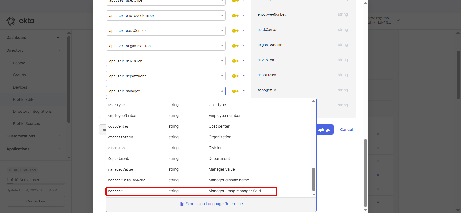 - Under ServiceOps SCIM to Okta user, map appuser.manager field against the managerId of Okta.