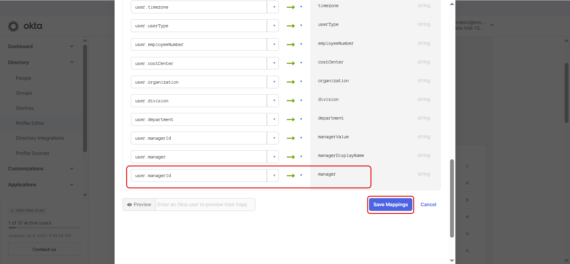 - Always verify after saving that the mappings display the correct links between Okta fields and ServiceOps fields.