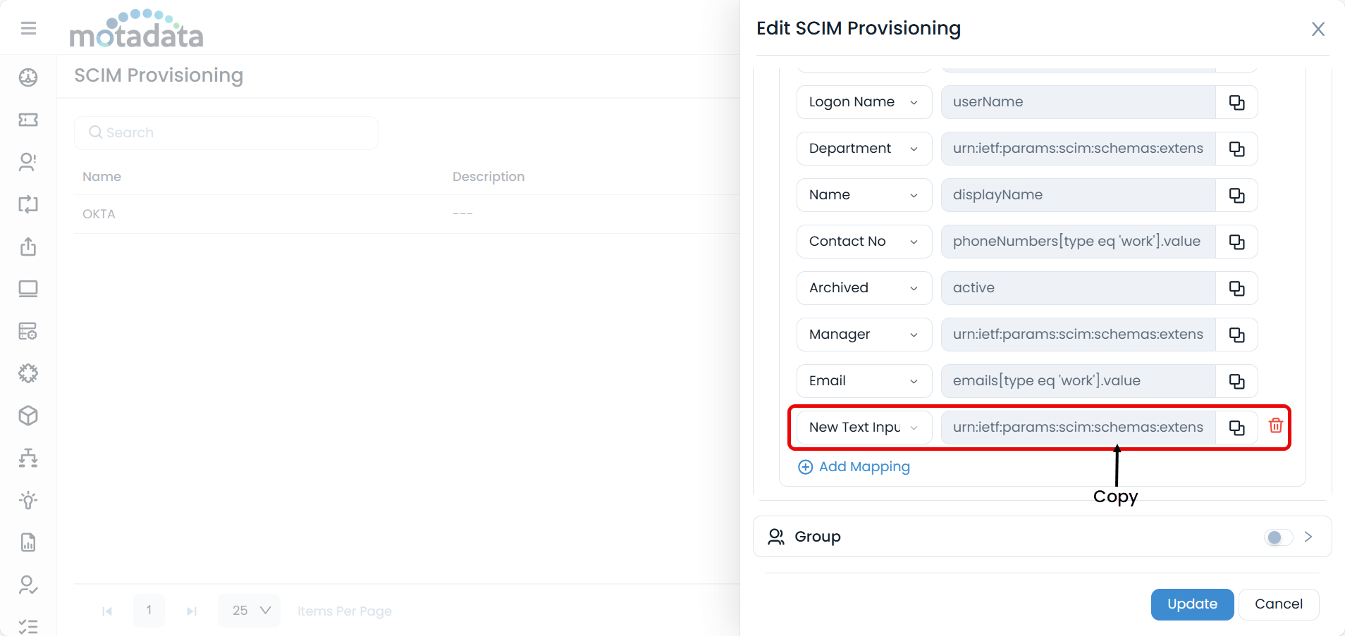 - From your ServiceOps SCIM configuration page, copy the complete value of the custom field.