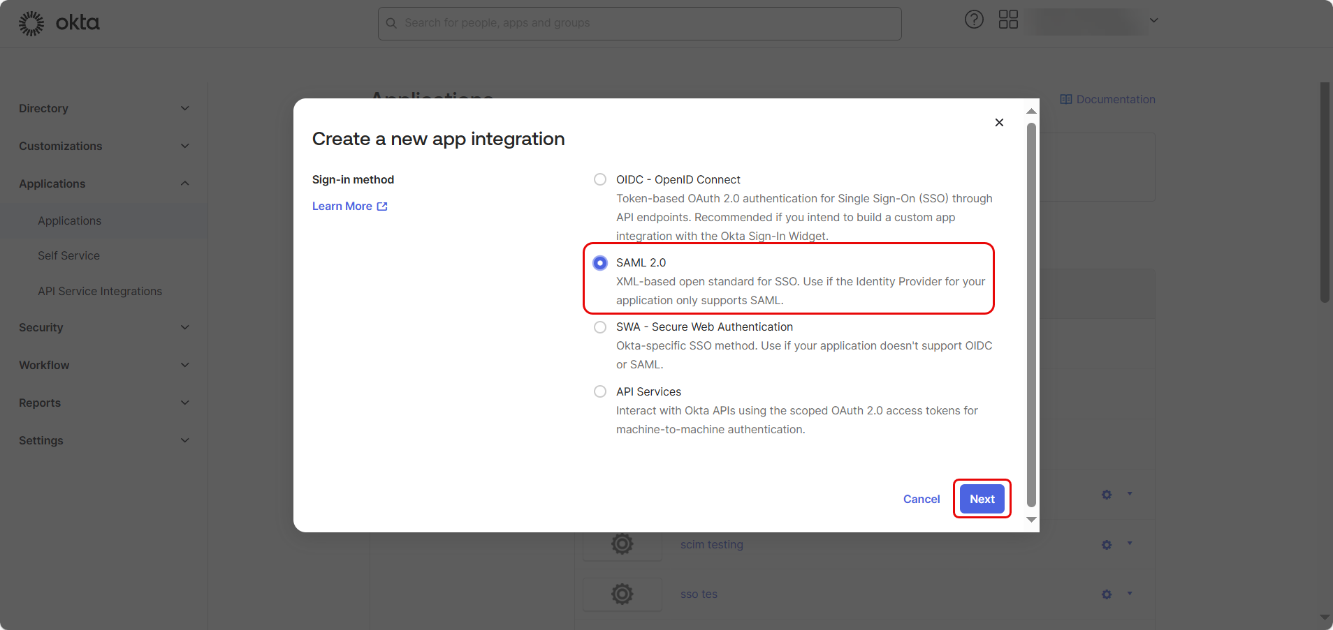 - In the "Create a new app integration" dialog, select SAML 2.0 as the Sign-in method and click Next.