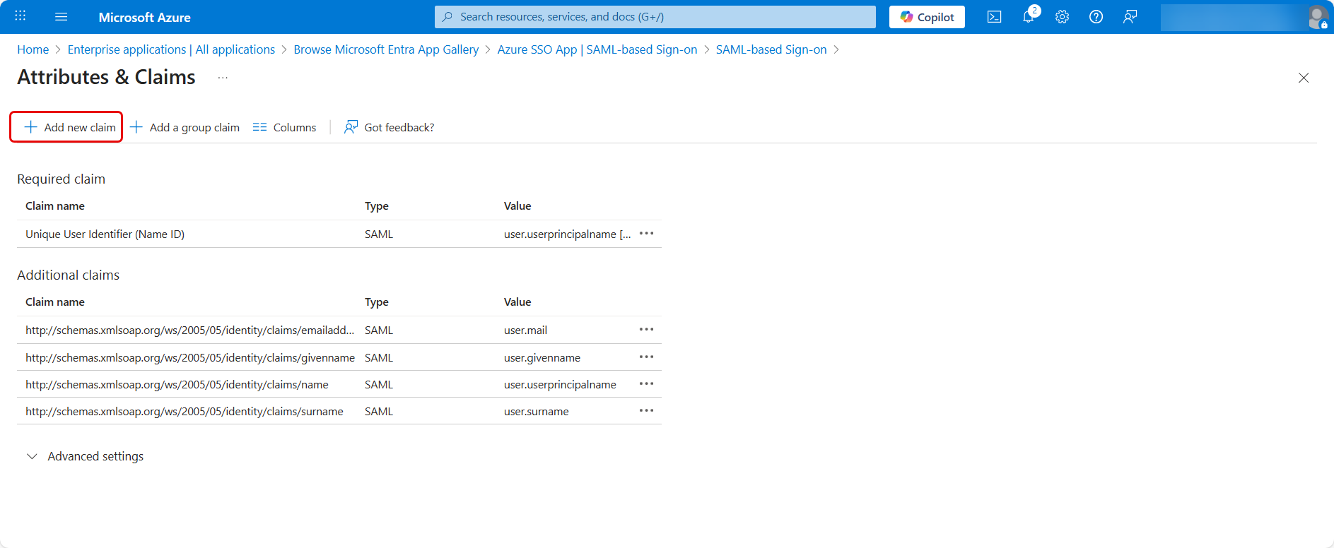 - Edit the Attributes & Claims and add a new claim for mapping the field with the ServiceOps field. Here, Company field is mapped.