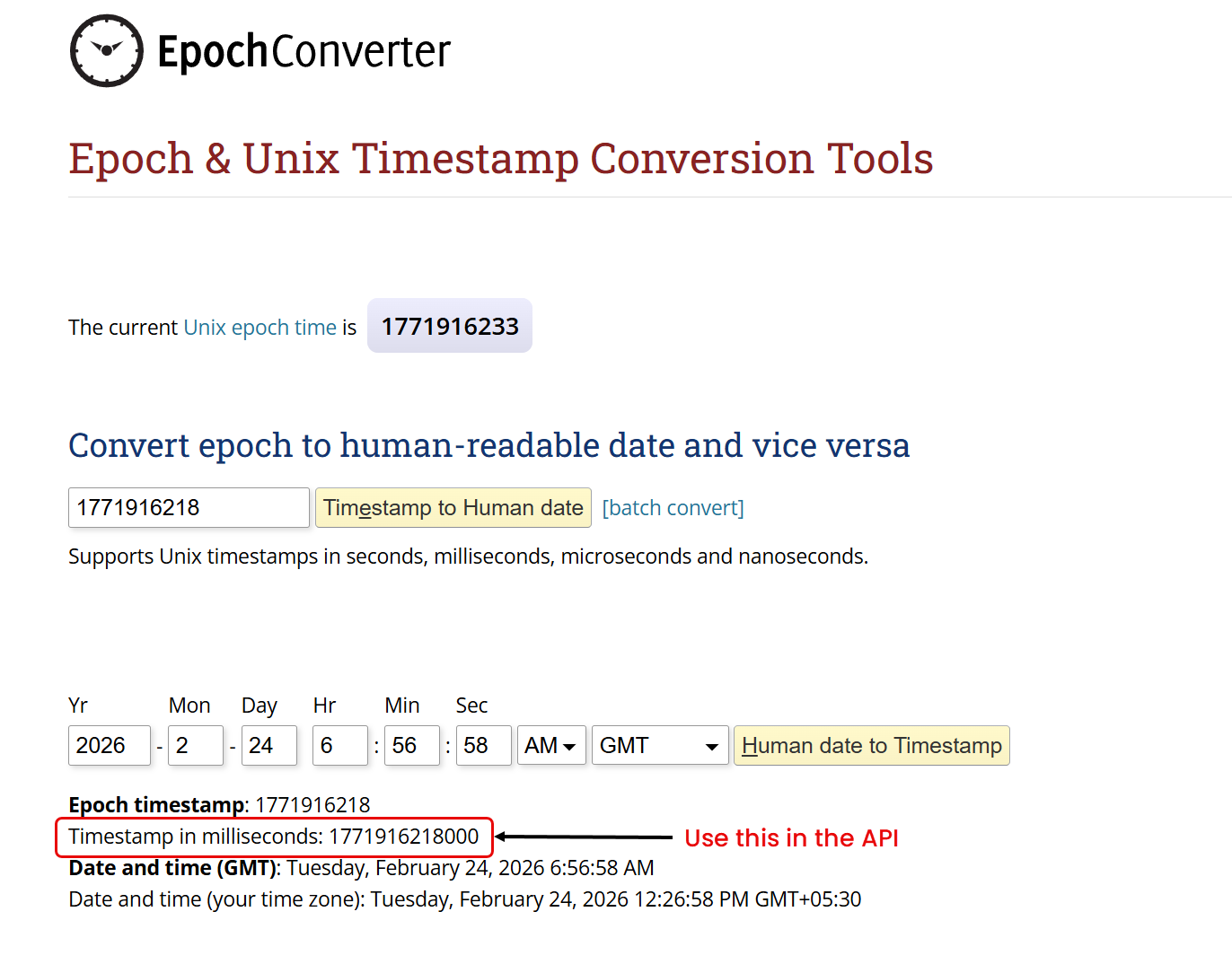 To add a date field in the custom DateTime field, you need to pass the timestamp in epoch milliseconds. You can get the current timestamp in epoch milliseconds using the online tool like Epoch Converter as shown in the image below.