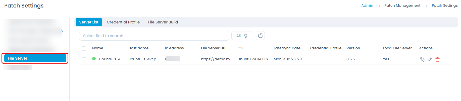 - Verify that the File Server service is running and is accessible from the Main Site over the network. You can view the installed File Server in the Admin > Patch Management > Patch Settings > File Server > Server List tab as shown below.
