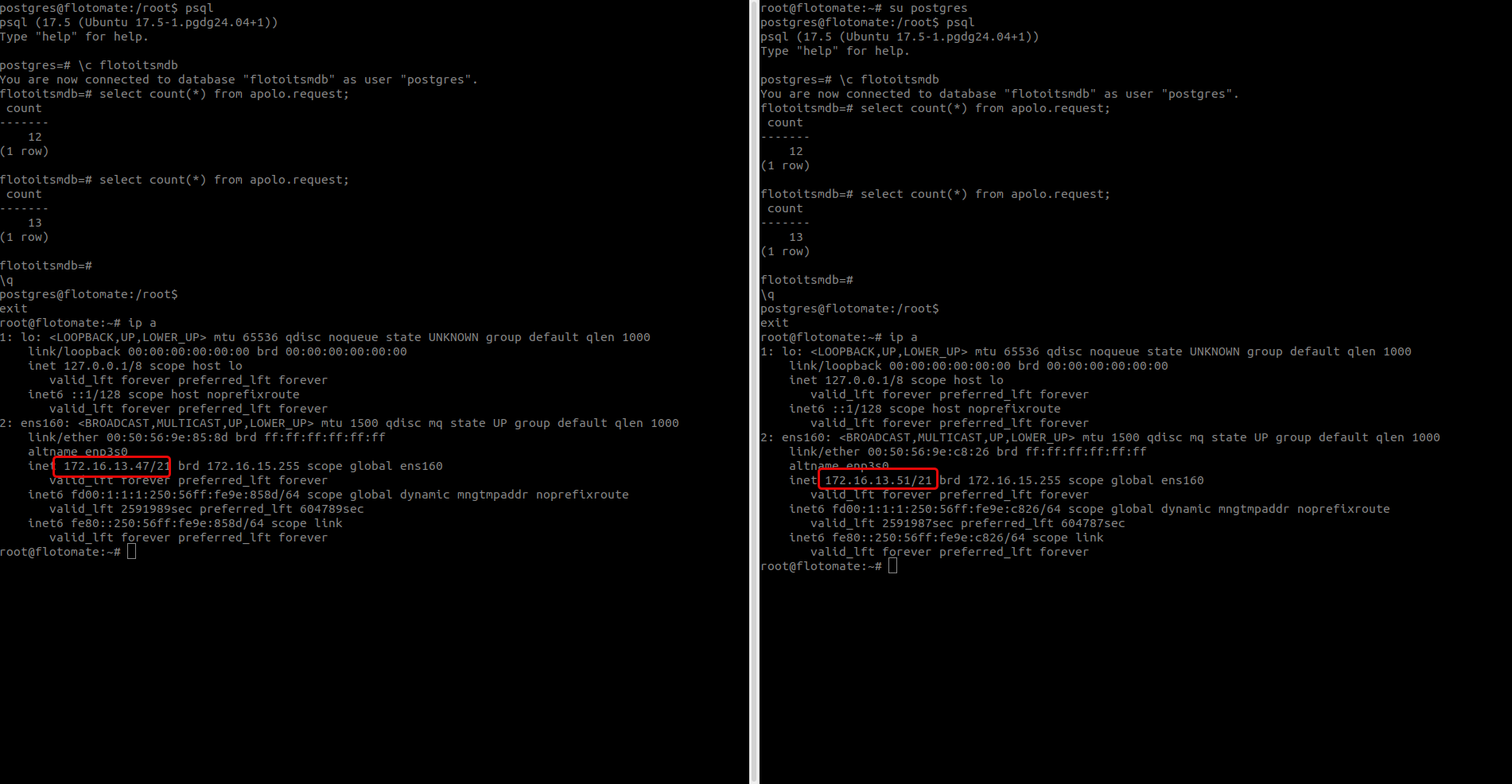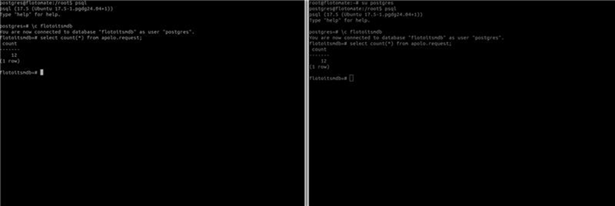 Connect to the PostgreSQL database on both DC and DR servers.