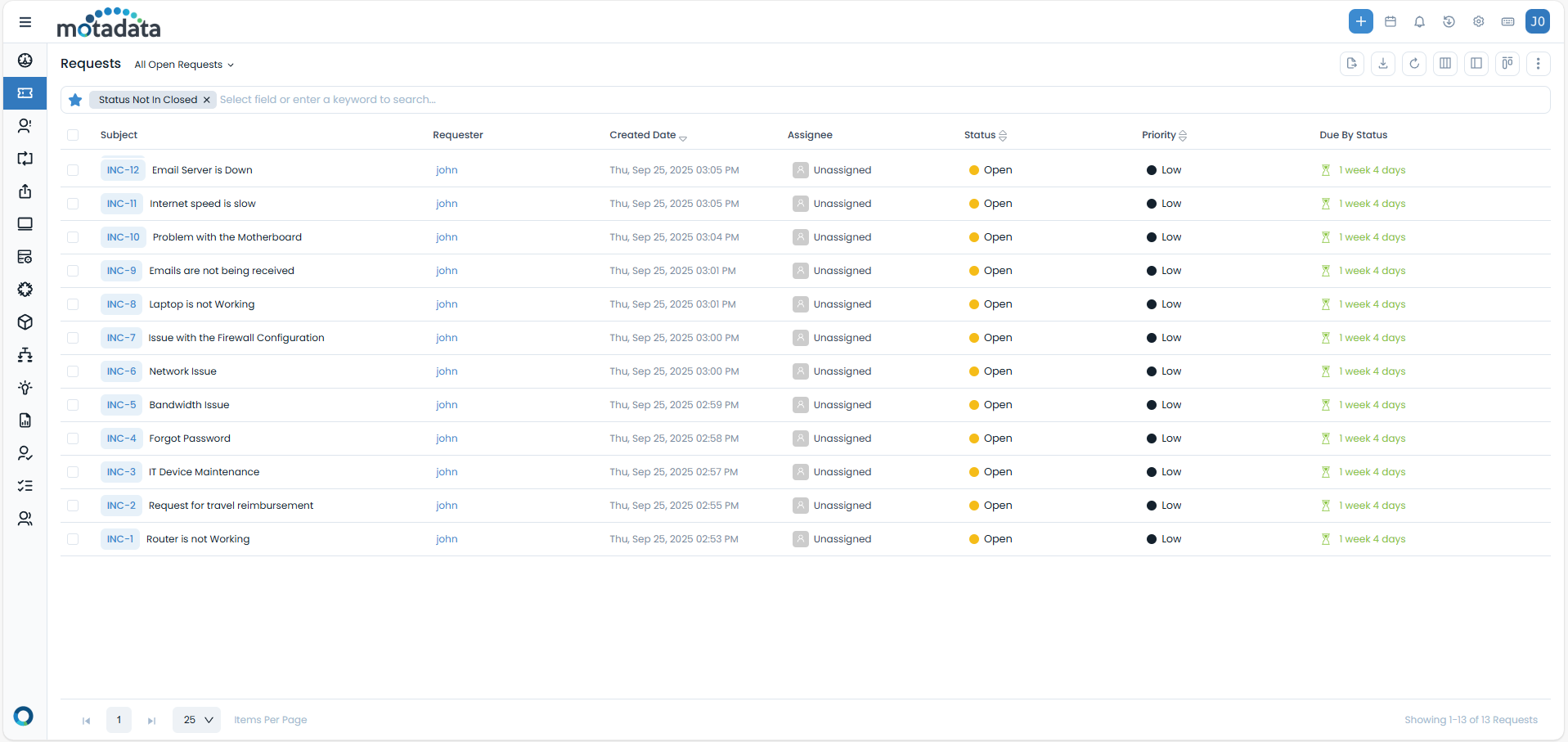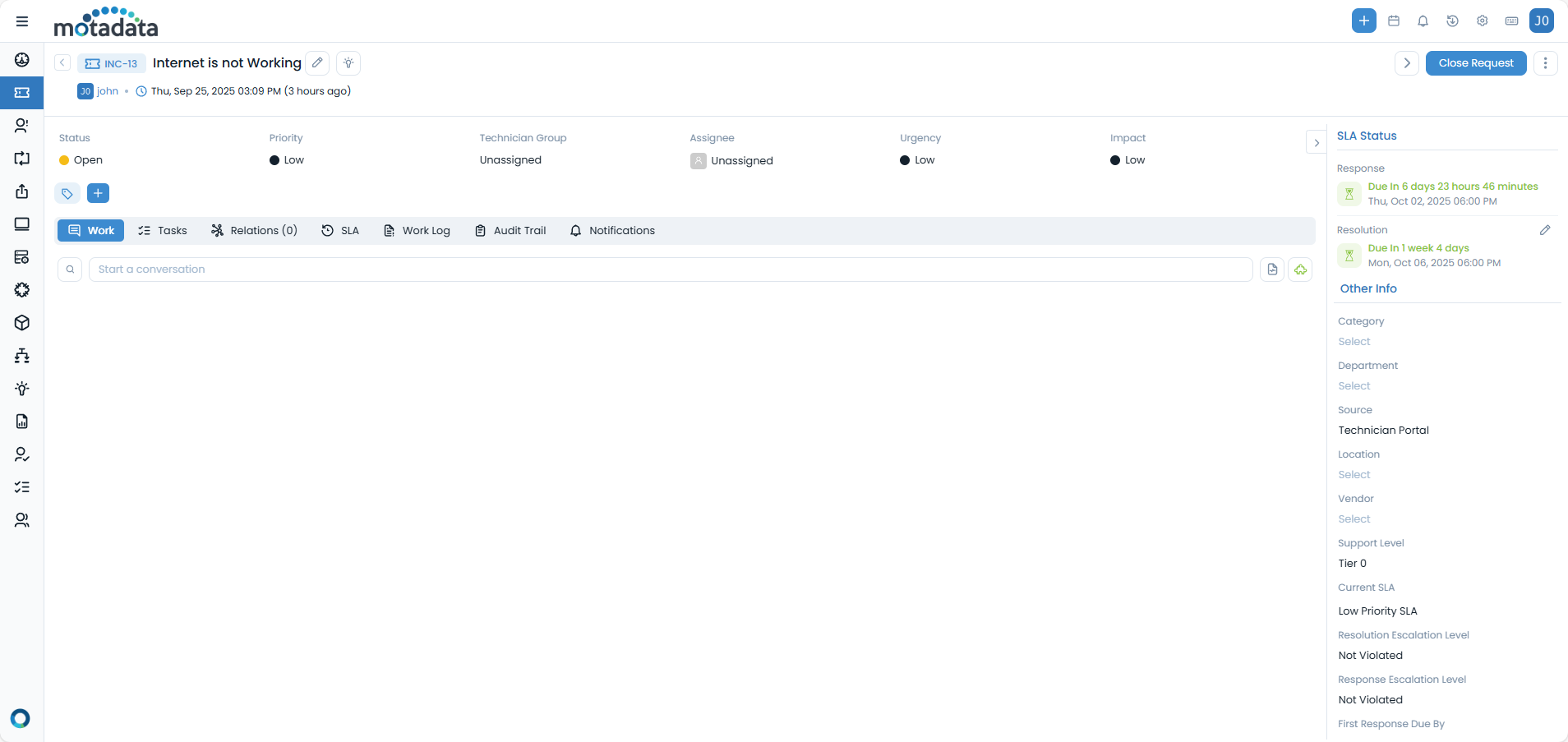 Create a new request/ticket from the ServiceOps application (e.g., ticket INC-13).