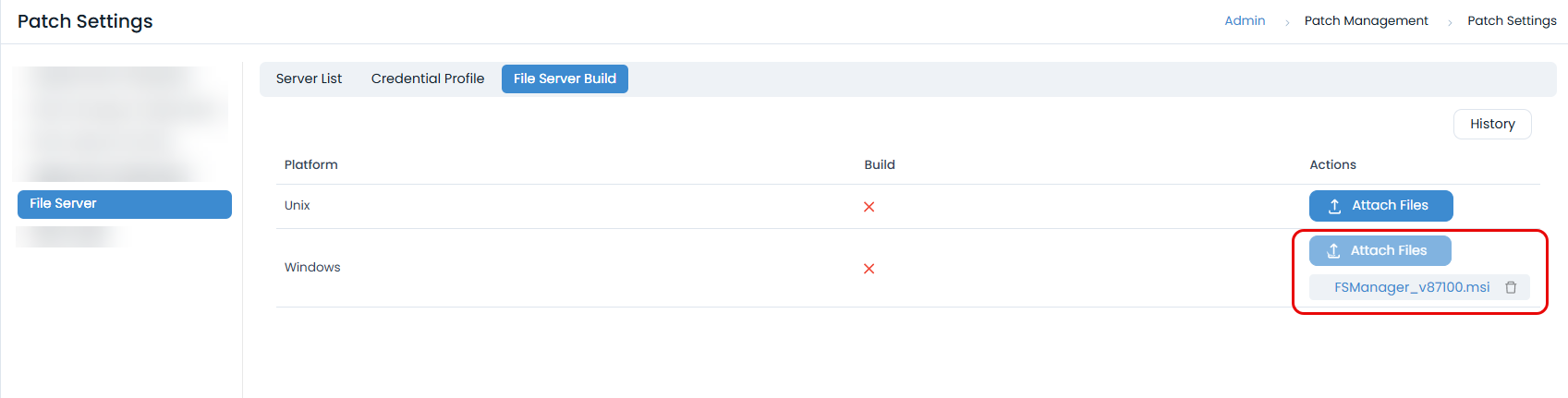 Verify Upgrade Status (Bulk): In the File Server Build sub-tab, click the History button to view the status. The Version column in the Server List will reflect the new build number.