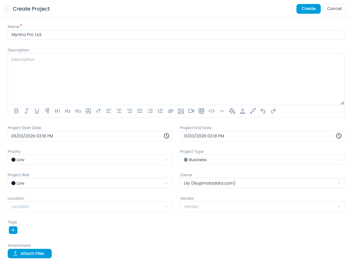 | Project Risk | Assess the risk level (default: Low) | Yes |