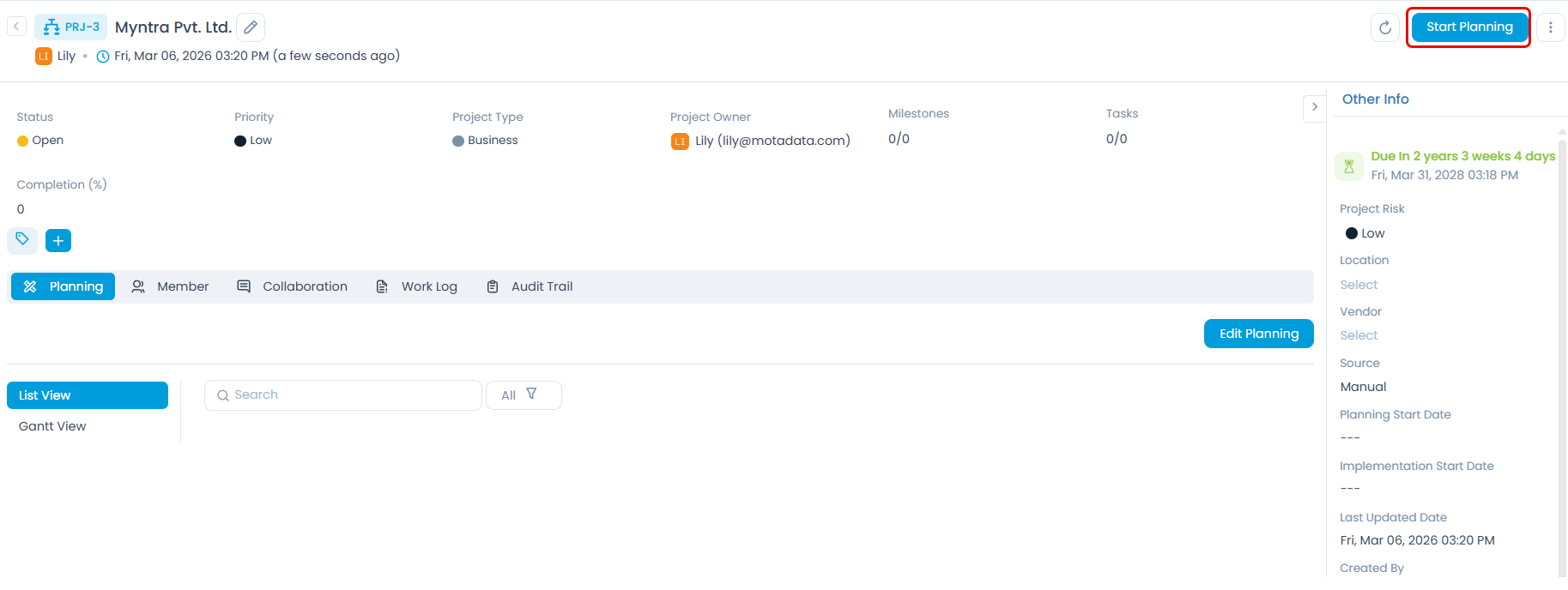 Before starting planning, a project owner must be assigned. Only assigned members can participate in project planning.