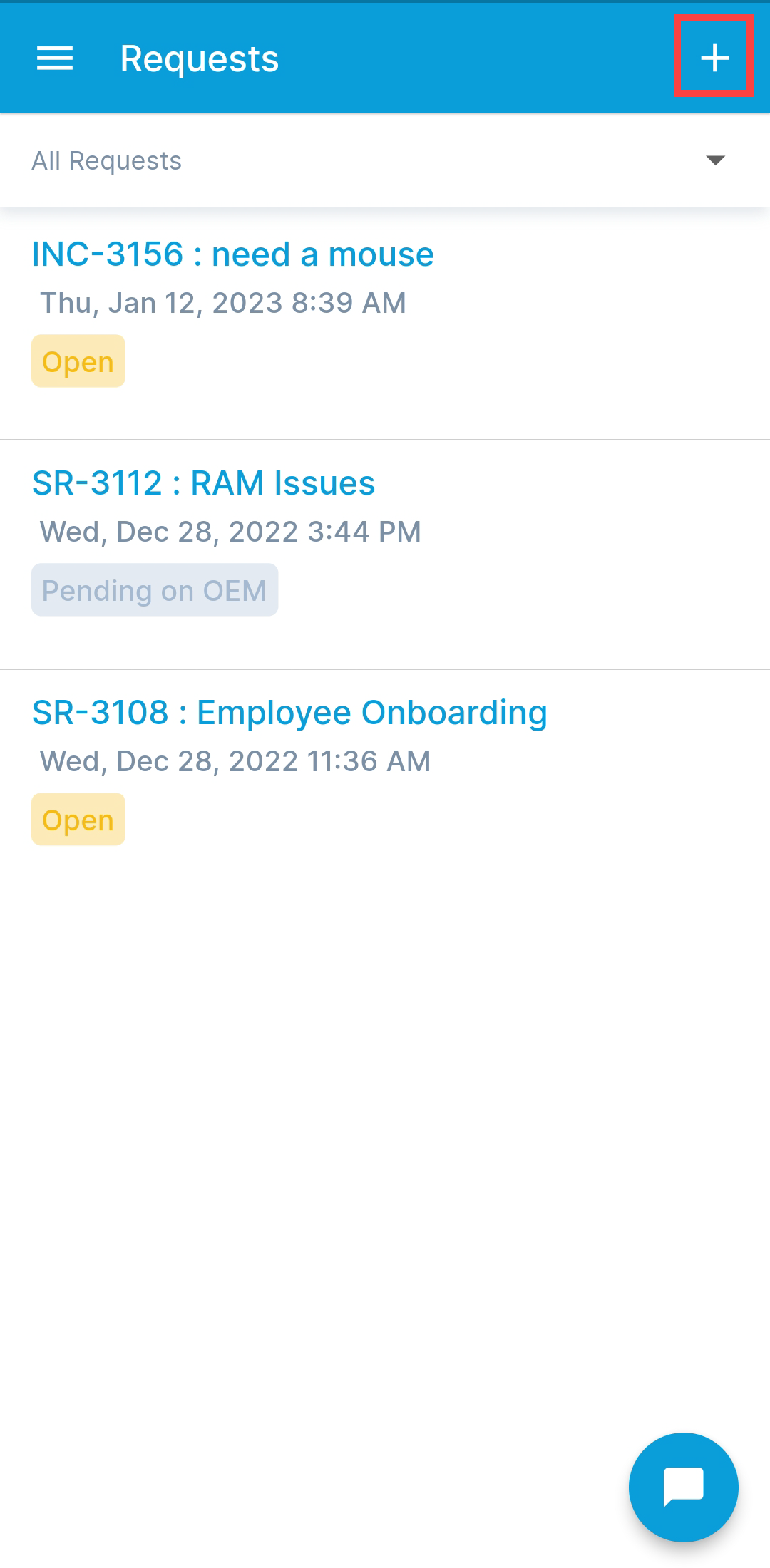 - Filter Options: View All Requests, Open Requests, Closed Requests, etc.