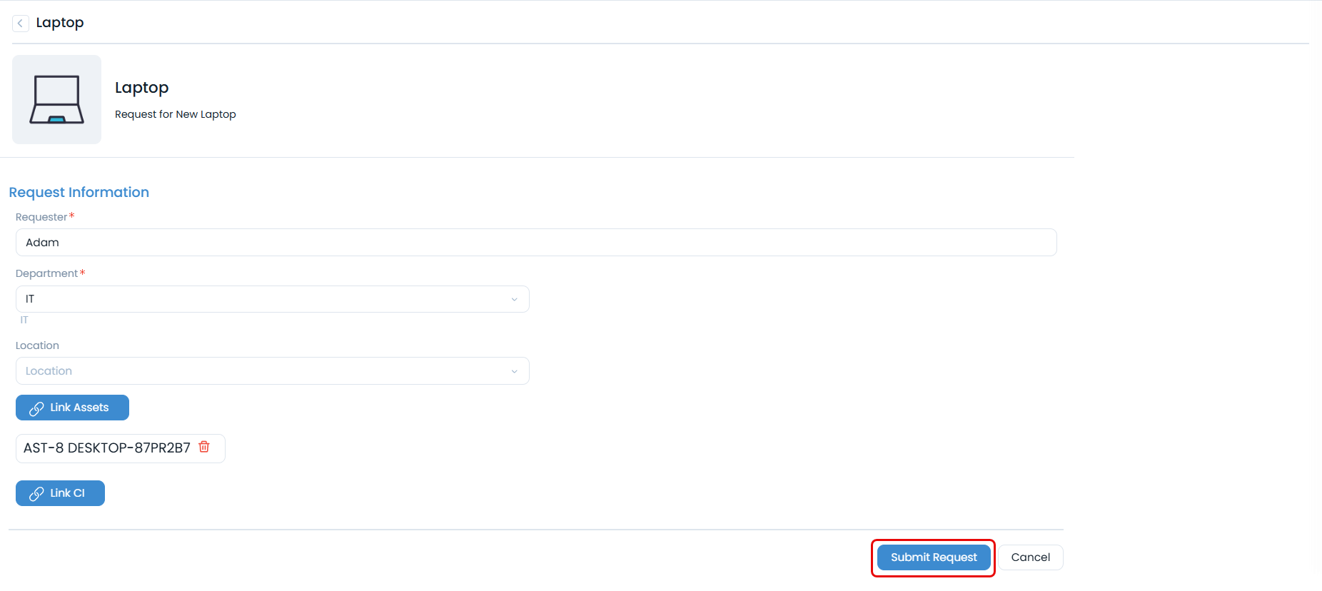 - Link Assets: Associate hardware or software with your request. (Available only if the Link Asset permission is granted from the Support Portal Settings and the respective Service Catalog.)