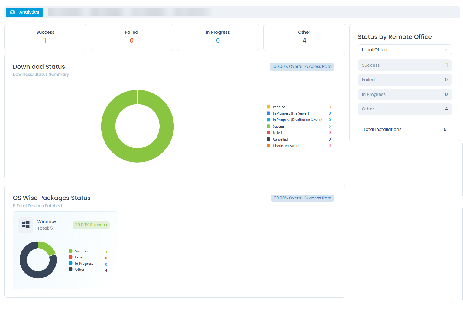 This section provides the deployment status based on the operating system, including a donut chart showing the success rate and counts for Success, Failed, In Progress, and Other statuses.