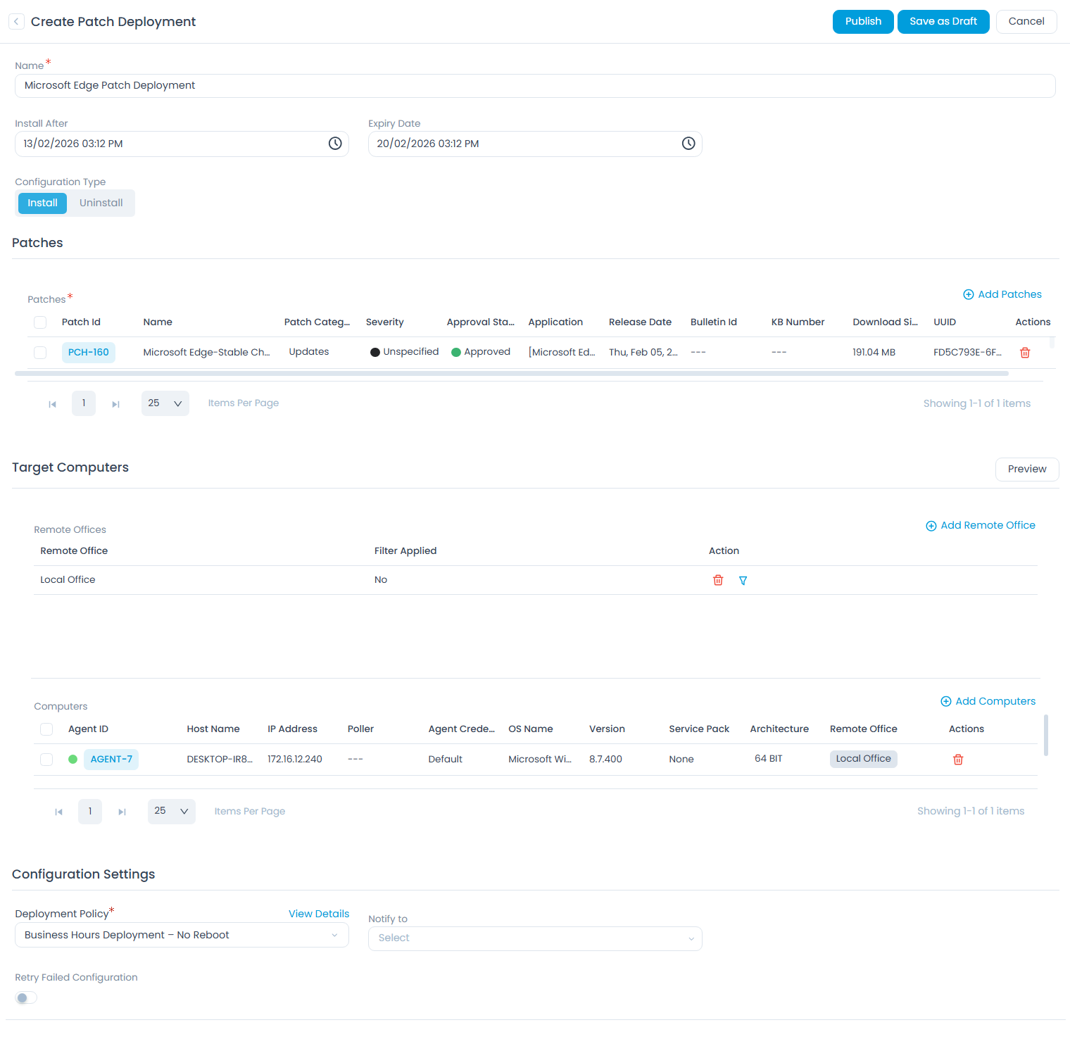 - Once all the configurations are done, either click Publish to publish the deployment or click Save As Draft to save it and publish later. If required, you can also click Cancel to stop the patch deployment process. Once published, the status of the patch deployment changes to Ready to Deploy and the Installation Status becomes Yet to Receive. This status changes as and when the installation process moves further.