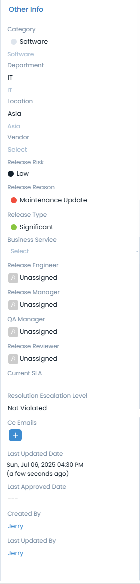 - Category: Shows the category of the release. Default values are: Software, Hardware, Network, HR, or Other.