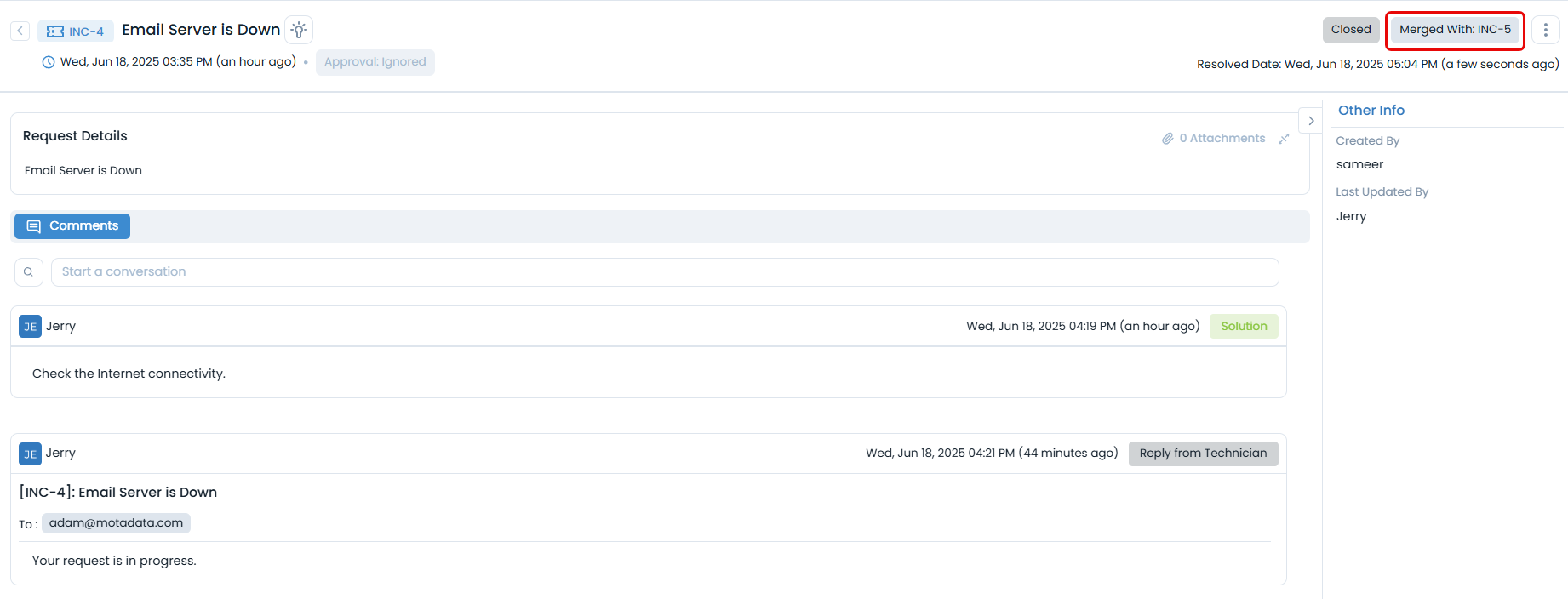 In the Merge process, one request is considered as the Primary Request, and all others as Secondary. As a result, the secondary requests link to the primary request. Also, the secondary requests will get closed once merged. Additionally, an email will be sent to the requester related to the request closed due to merging.