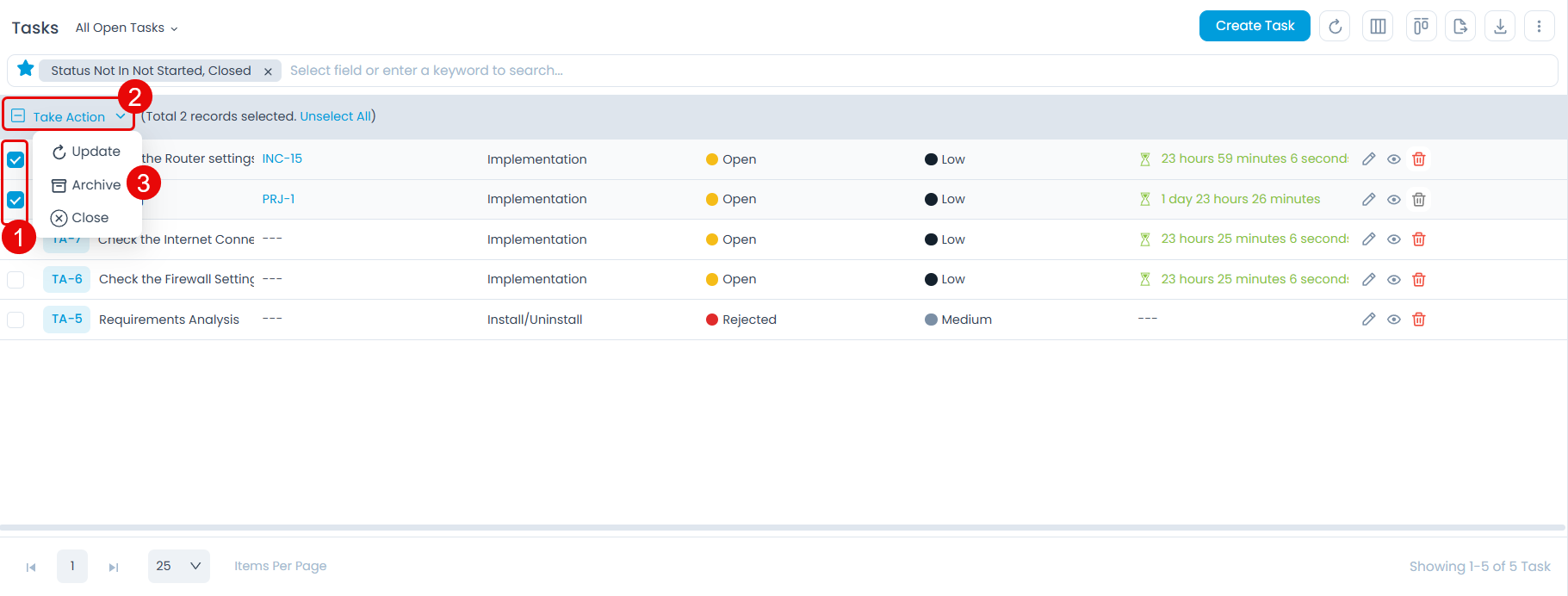 Bulk Operations: You can perform bulk operations on the selected tasks. The options are: