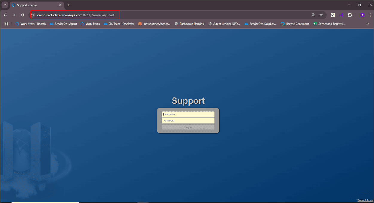 ?serverkey=test: Query parameter used during initial server validation. If your domain was, demo.motadataserviceops.com, then it would look like: