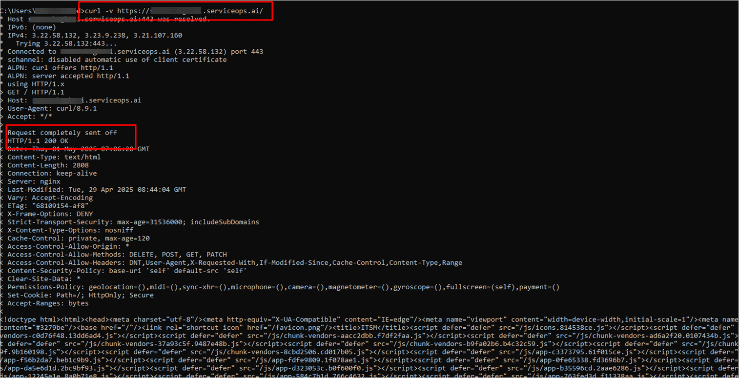 curl -v {serverURL}Example:curl -v https://sameerboghani.serviceops.ai/The connectivity is successful if the response includes HTTP/1.1 200 OK.