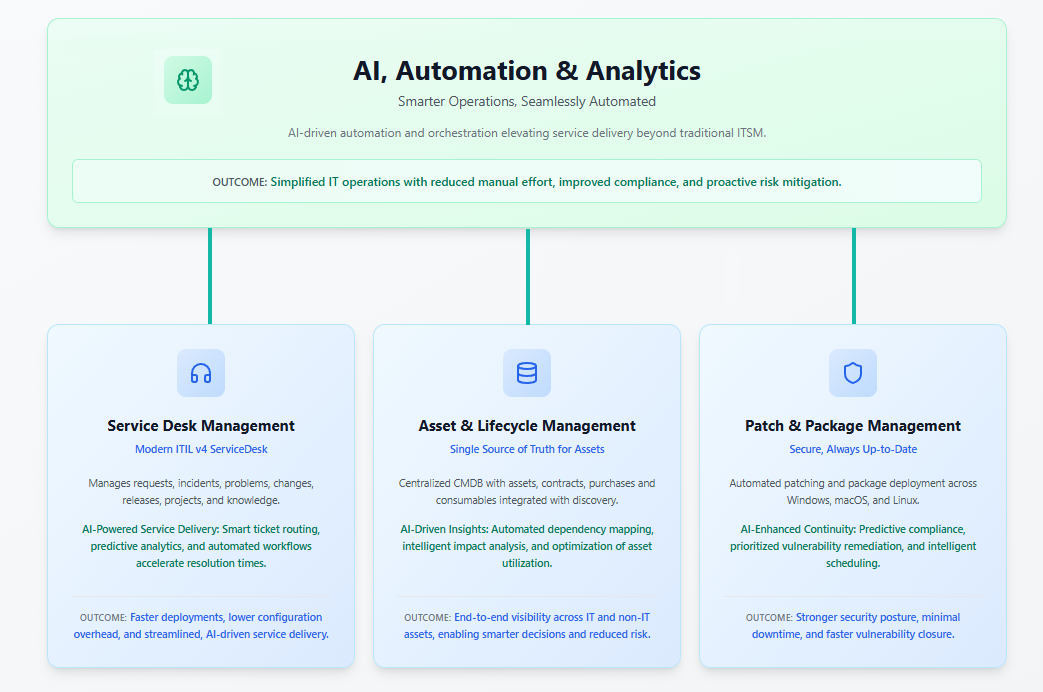 Outcome: End-to-end visibility across IT and non-IT assets, enabling smarter decisions, proactive maintenance, optimized resource allocation, and reduced operational risk through intelligent insights and comprehensive lifecycle management.