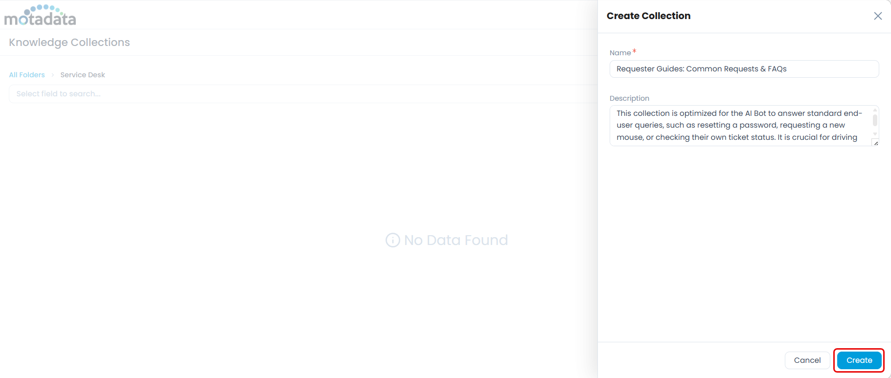 Collections live inside folders. If you have not created a folder yet, do that first, see Managing Knowledge Folders.