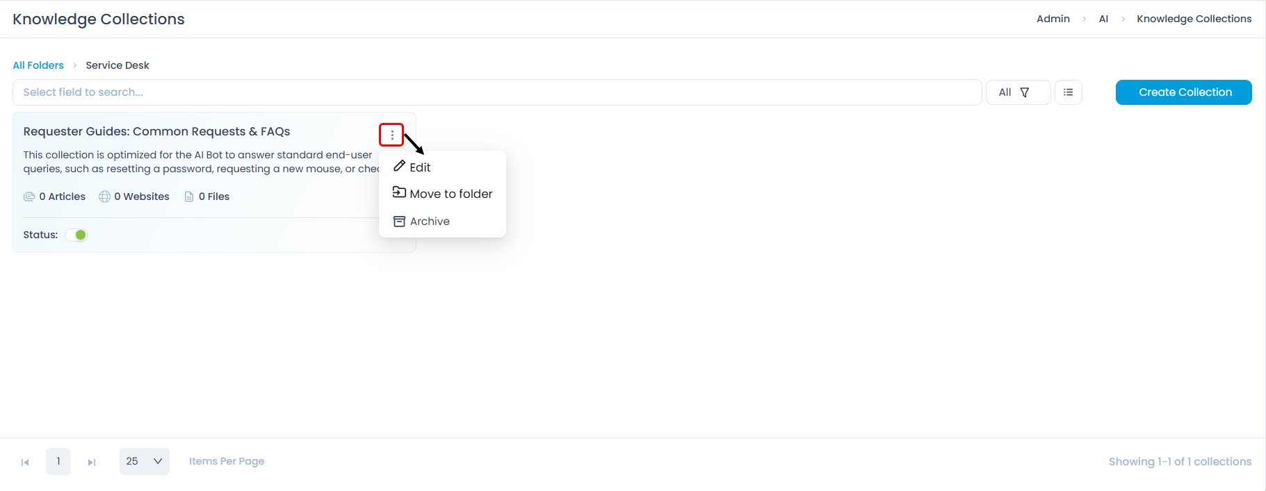 Navigate to Admin > AI > Knowledge Collections and click the folder in which you want to create the collection. The folder's collection list page appears.