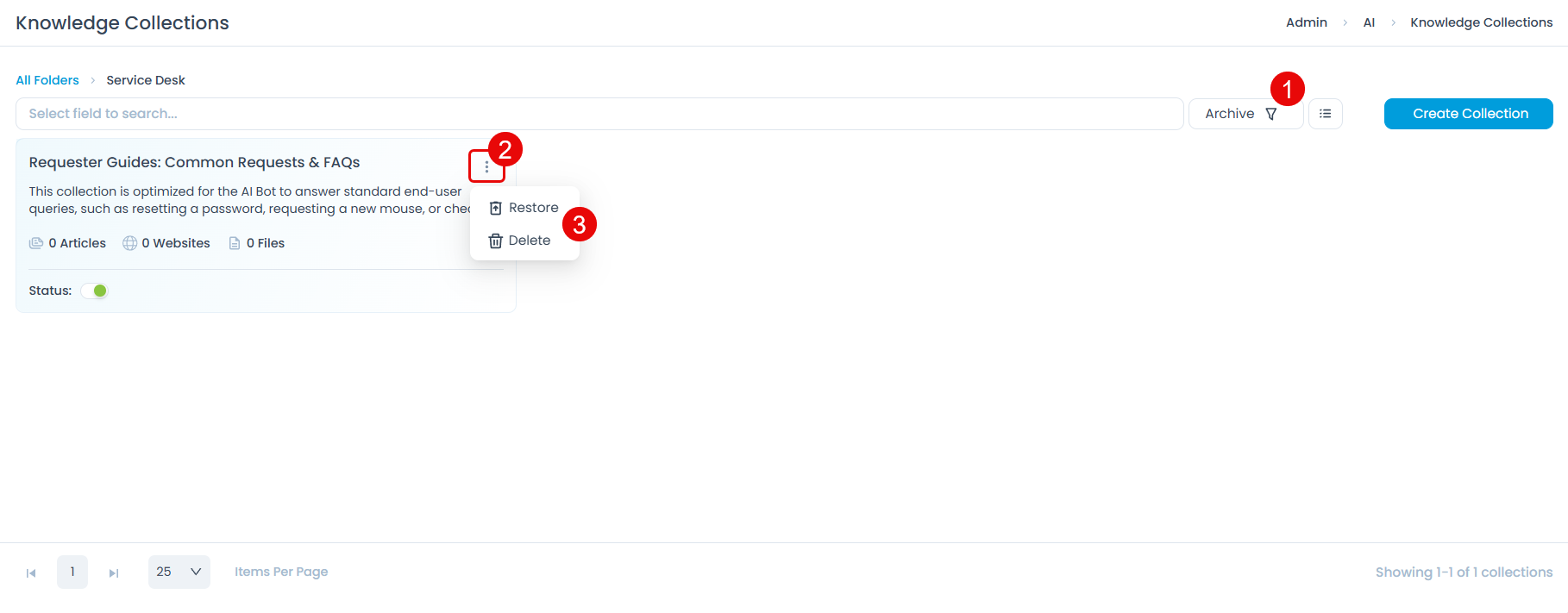 To manage archived collections, select the Archive filter on the folder's list page. From the three-dot menu on an archived collection appears: